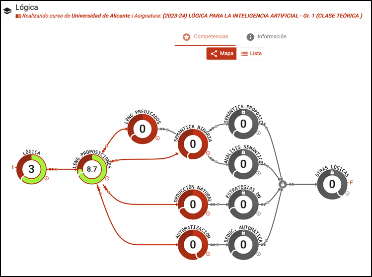 Las competencias (o niveles) están ordenadas según las dependencias lógicas entre ellas, marcando diferentes itinerarios de aprendizaje (diferentes recorridos de los niveles del juego) y con algunas competencias que se encuentran desbloqueadas (desbloqueo de niveles). Este mapa (ver figura) representa todo el curso y también el estado actual del aprendizaje del estudiante, con las competencias superadas y en qué medida las ha superado.